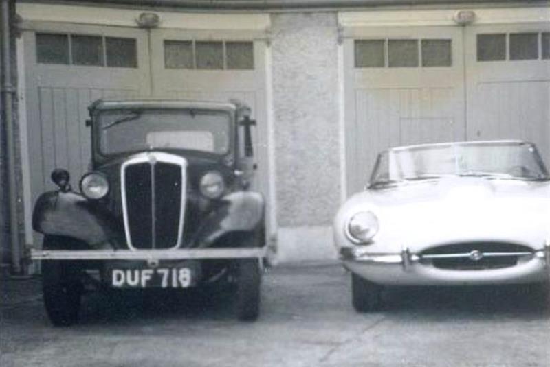 Morris 8 sharing the drive with a Henlys showroom delivery E Type.