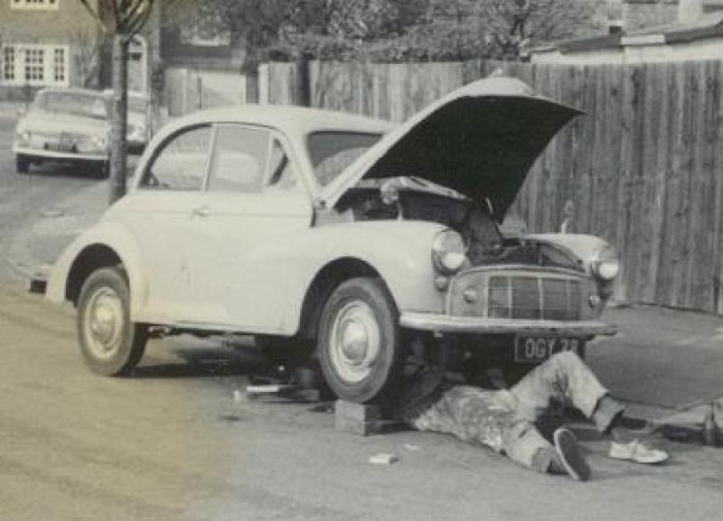 Marjorie's first car Morris Minor, later sold to Pete Loe is investigating the underside.
